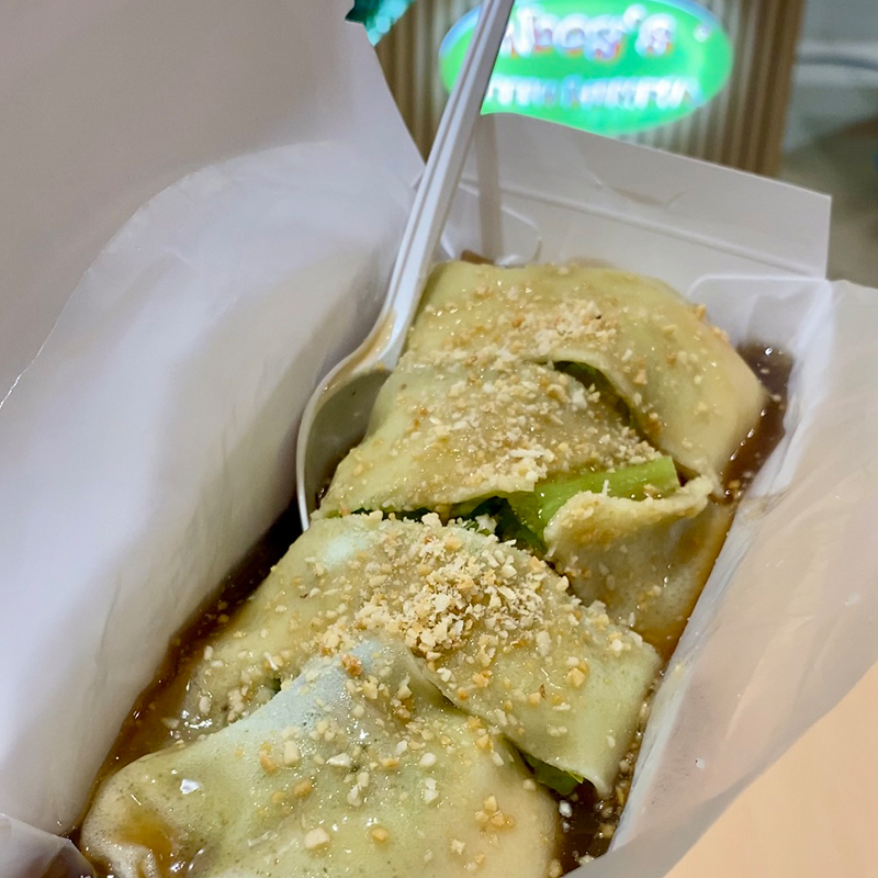At the same time, the need to offer something “Filipino” and uniquely different from a Chinese spring roll persisted. Hence, the idea of an all-vegetable “Fresh lumpia” with the option of an egg wrapper roll, freshly cooked on site, came to life.